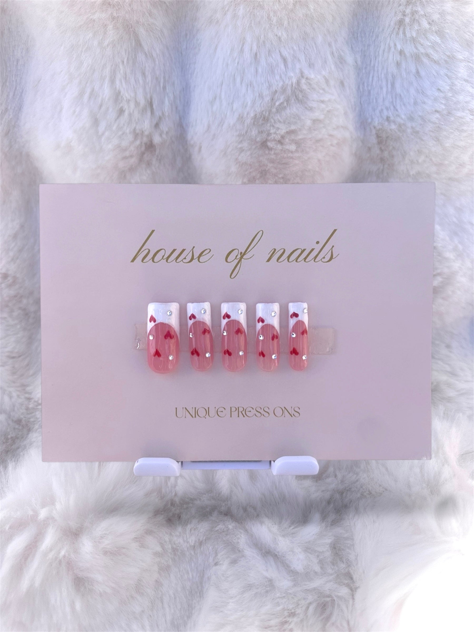 Show off your bold side with Lovers Touch. Classic French tips meet fierce red hearts and sparkling bling to create a look that radiates confident, bad bitch energy. Perfect for standing out with style and attitude.